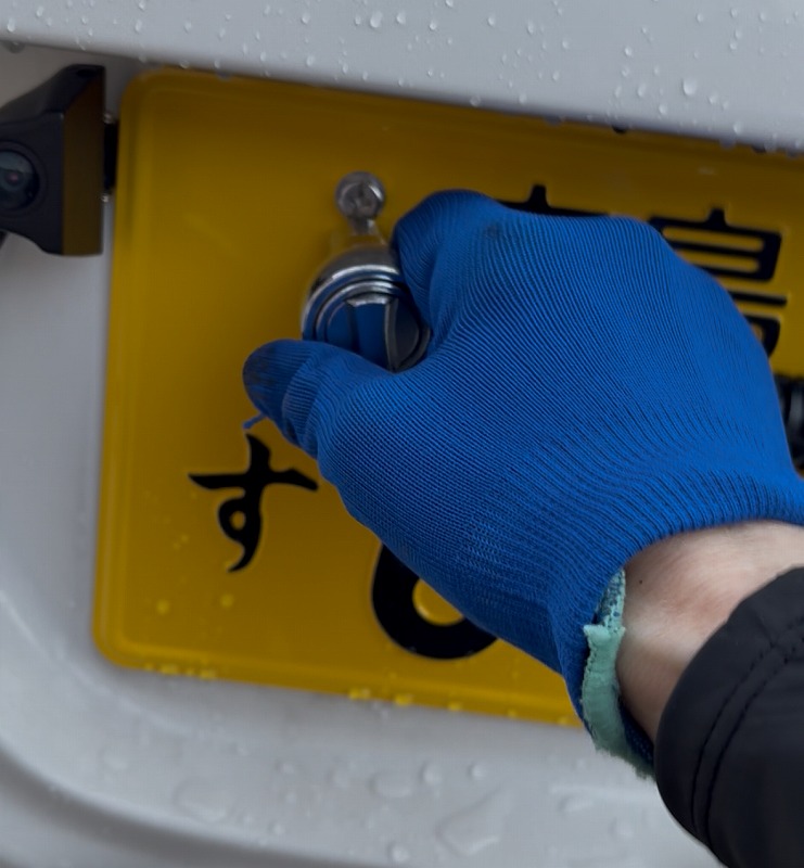 ナンバープレート外すと大きな穴が、そして、そこから腕が入るよ!