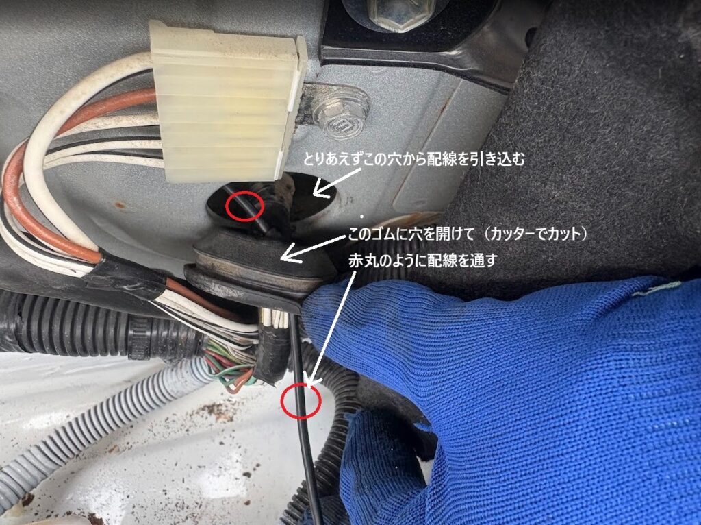 次の写真は配線を通したところです。赤丸のが通した配線です。