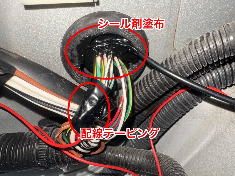配線が見えるが赤丸したとこに水の侵入を防ぐゴムキャップがあるので