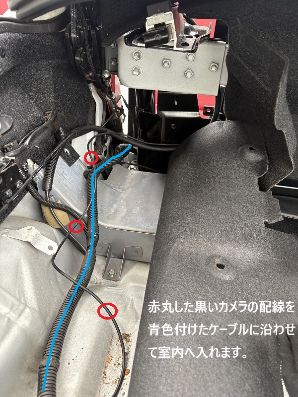 カメラの配線(赤〇した線)を室内へ持っていきます。