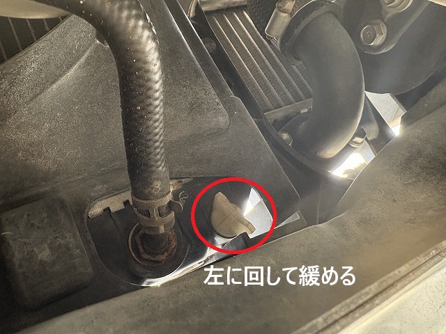 とりあえず車の下にもぐり、少しコックを回して緩めておいて出ました。