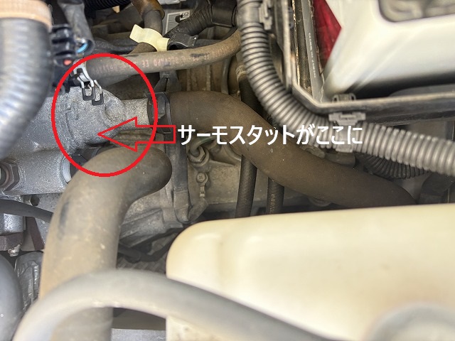 赤丸したカバーの中にサーモスタットがあります。