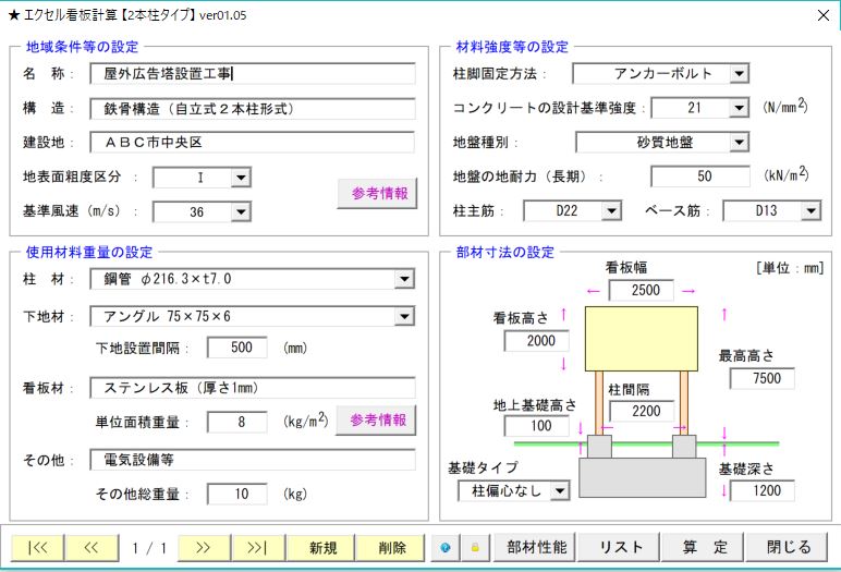 自立式の広告塔(2本柱形式)に関する構造計算を簡単に行うことができます。