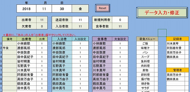 デイサービスにおいて、マウス操作で短時間に業務日誌と食数管理表ができます。