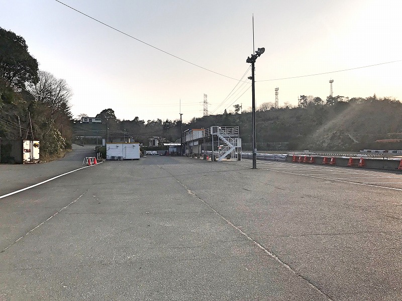 次の写真はパドックとピットそして手前の駐車場です。